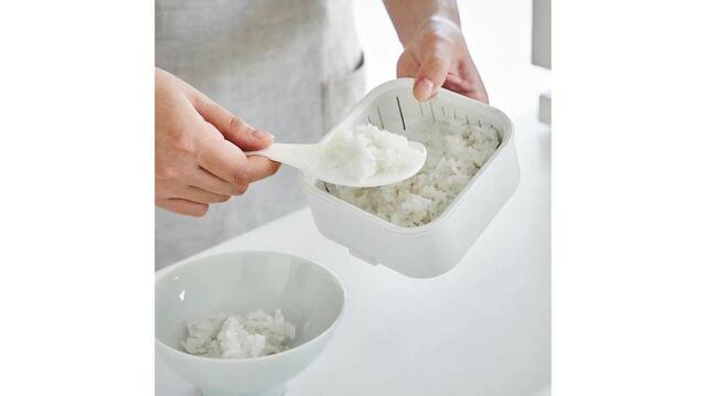 「温まりやすい立つ冷凍ごはん容器」は、一膳分(150g)の冷凍ごはんが入るサイズ。ザル付きなので、蒸気が全体に行き渡ることで温まりやすく、余分な水分は落としてくれます。