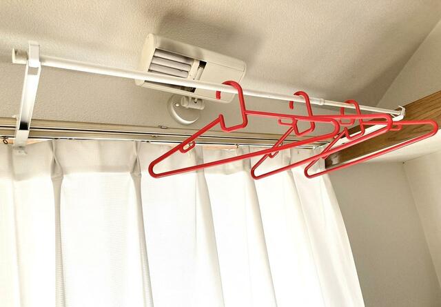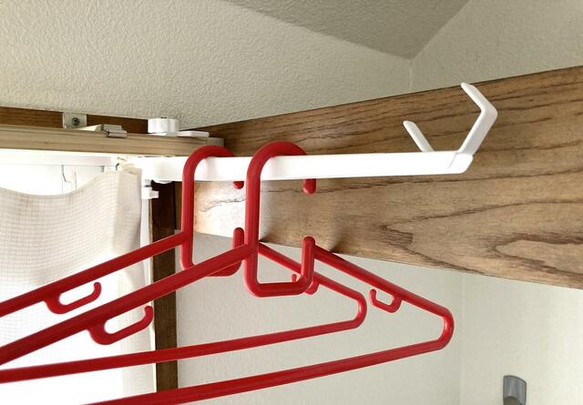 ハンガーは2本入りなので、写真のように、つっぱり棒を活用すれば簡単に物干しスペースができます。