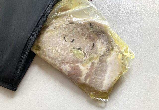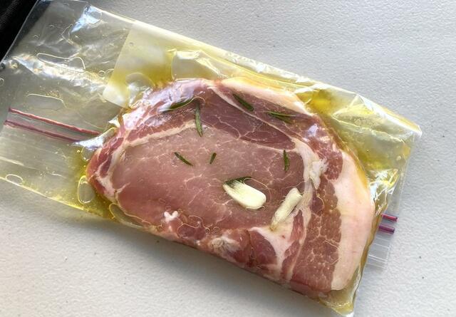 オリーブオイル、にんにく、塩、お好みのハーブととんかつ用ロース肉を、前日夜または朝食後に、ジップ袋に入れてマリネしておきます。