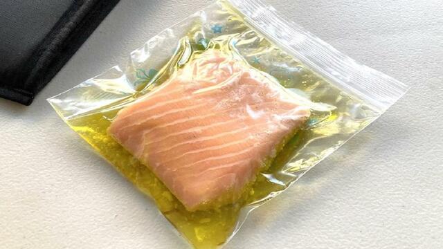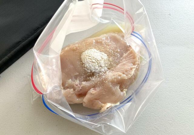 ジップ袋に材料を全て入れて、つやが出るまで調味料をもみ込んだら……