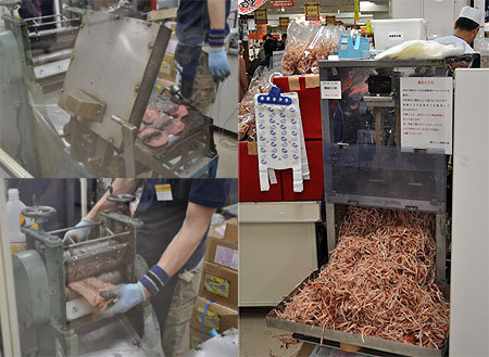 非常に面白かったのが、焼あたりめの実演販売です。特製しょうゆに漬け込んだイカを焼いて(画像左上)、隣で薄く伸ばして(画像左下)、最後は細切りにする機械(画像右)にかけます。一連の流れでできたものをその場でパッキングして、販売していました。出来立てのあたりめは、とても香りがよく軟らかいのに驚きました。オススメです。180g1,050円