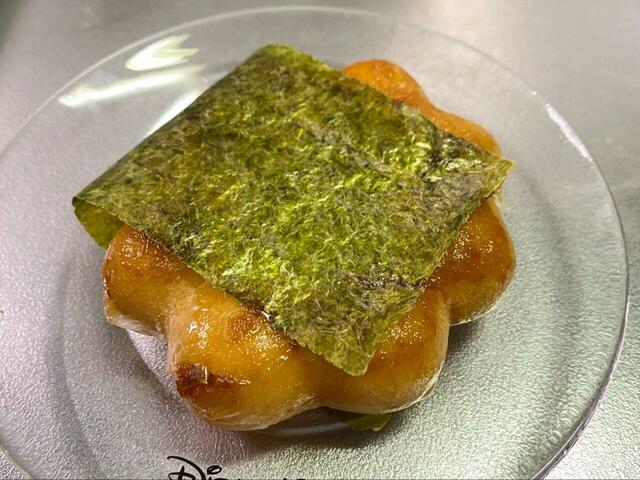 ポン・デ・リングのシュガーコーティングと出汁醤油で“あまじょっぱい”味が完成し、パリッとした海苔が全体の味をまとめています。