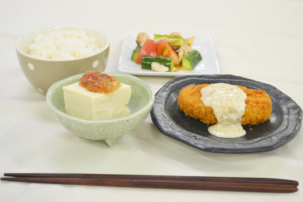コロッケに「タルタル旨だれ」、冷や奴に「かつおだれ」、きゅうり・ゆで鶏・トマトに「中華ねぎ塩だれ」をかければ……。「まぜてマジック」で作る素敵な献立のできあがり!