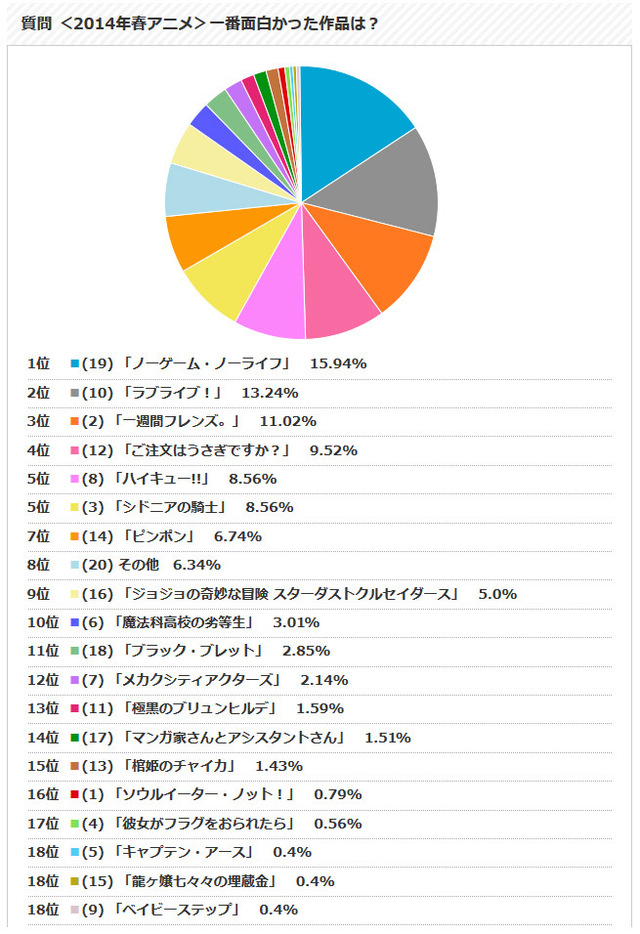 前回の結果はこの通り。1000人を超えるユーザーの投票により、異世界でのゲームバトルを描いた「ノーゲーム・ノーライフ」が得票率15.94%で人気NO.1作品に選ばれました。