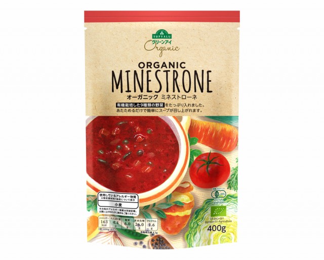 有機野菜をたっぷり使用したトマトベースのイタリアンスープしっかりと残る野菜の食感とトマト味がマッチ。400gで価格は321円(税込)です。