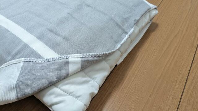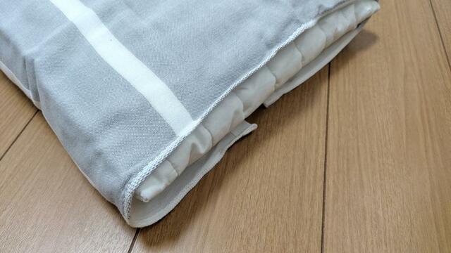 私が使っている肩までのせられる大きい枕には少し幅が足りませんでしたが、上下で折り込めるくらいの長さはあります。少しずれてしまいますが、朝まで外れてしまうことはありません。