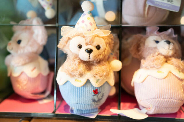 また、スタンダードなぬいぐるみだけでなく、パーティーハットを被ったダッフィーたちのぬいぐるみも。