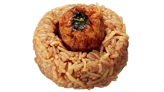 そば飯をおにぎりにし、たこ焼が丸ごと1個のっています。たこ焼の下にはマヨソースを忍ばせてあります。