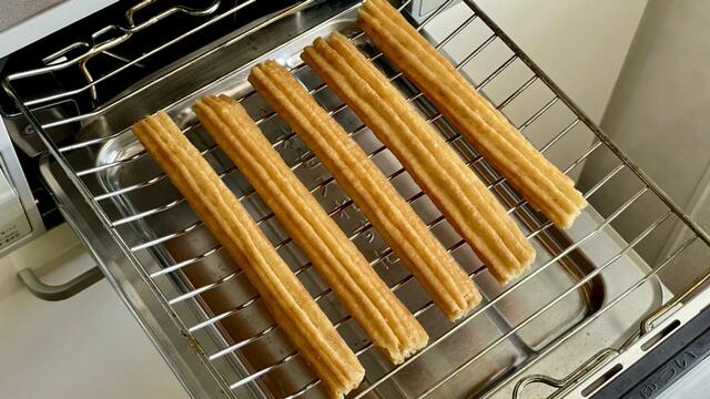 冷凍チュロスは油で揚げるタイプのものが多いなか、これは焼くだけでつくれるのはラクでいいなあと思い手に取りました。
