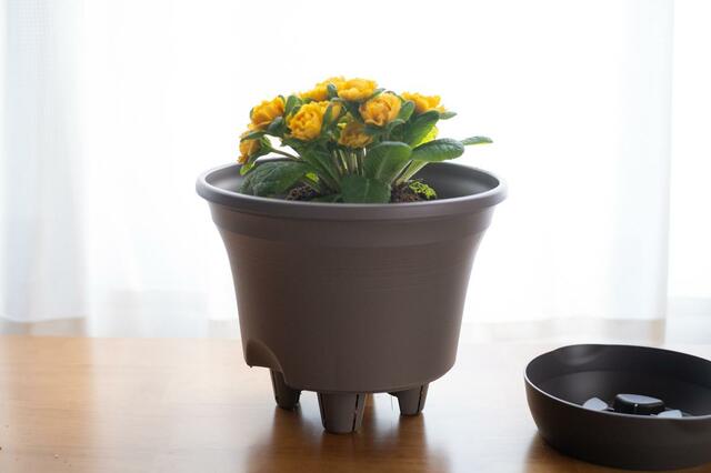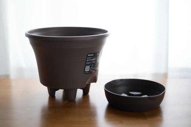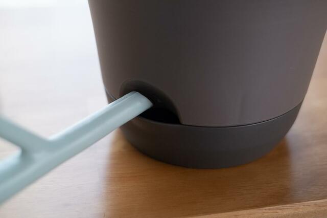 受け皿に入った水がでこぼこした鉢植えの底に触れて、土と根っこに水が吸い上げられるという仕組みです。
