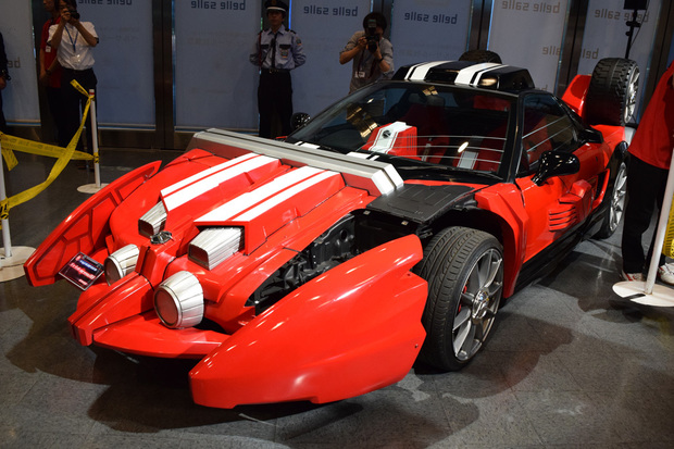 スーパーマシン『トライドロン』。運転席横のカーナビが置かれる位置のあたりに、ドライブドライバーが設置されていたらしい。クルマの後部に太いタイヤを装備しており、販売予定のおもちゃを見ると、三段変形なども行うようだ。 関連記事