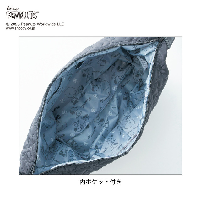表面はよく見ると、初期スヌーピーのフェイスがモチーフとなった、キルトのデザイン! さりげない可愛さがファンの心をくすぐります♪