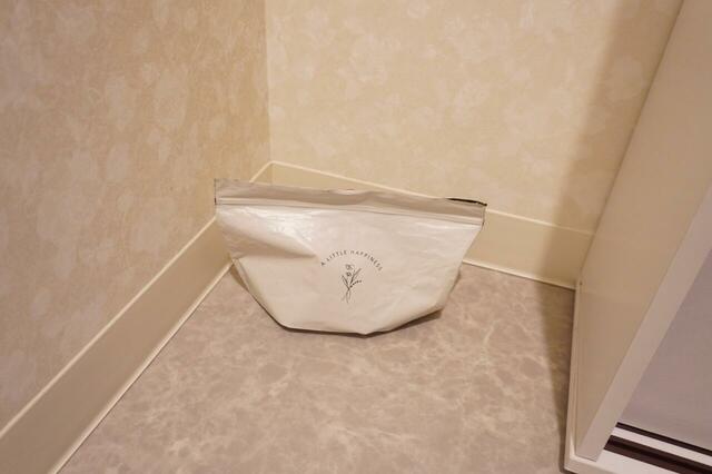 こちらはビニールタイプのサニタリーバッグです。明るめのベージュのような色合いでどんなインテリアにもなじみやすいデザインです。