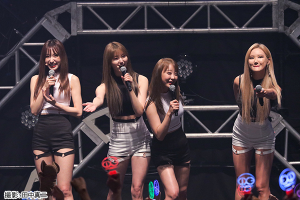 彼女達が、日本での活動の幕開けに選んだのは、8月22日(水)にリリースする日本デビューシングル『UP&DOWN』だ。エリー(メインラッパー)、ハニ(リードボーカル、リードダンサー)、ヘリン(リードボーカル)、ジョンファ(メインダンサー、サブボーカル&リードラッパー)4人がフォーメーションを組み、一人ひとりを紹介するようにステージが進行する。グループとしての魅力だけではない、メンバーの個々のパフォーマンスが見て取れる。