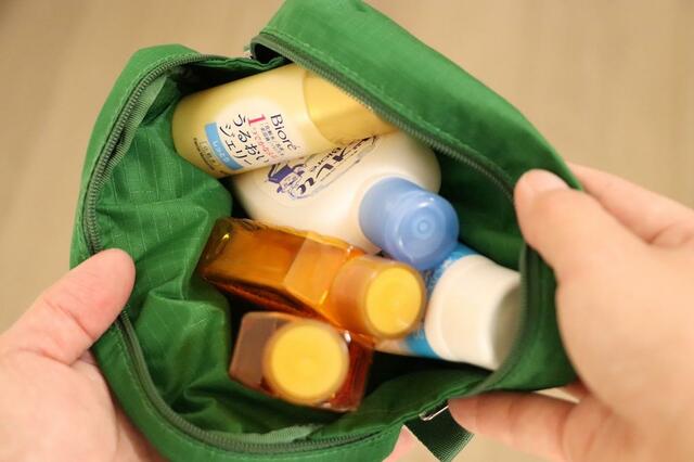 タフなポーチですが防水機能はないので、トラベル用のシャンプーや化粧水を入れるときは、ボトルに付着した水滴は拭き取ってから収納する方がおすすめです。