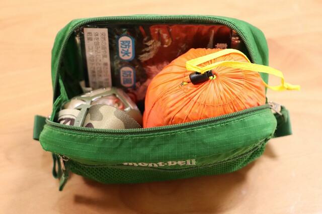 私は登山用バックパックに入れているヘッドライト・エマージェンシーシート・ツェルトを収納しています。