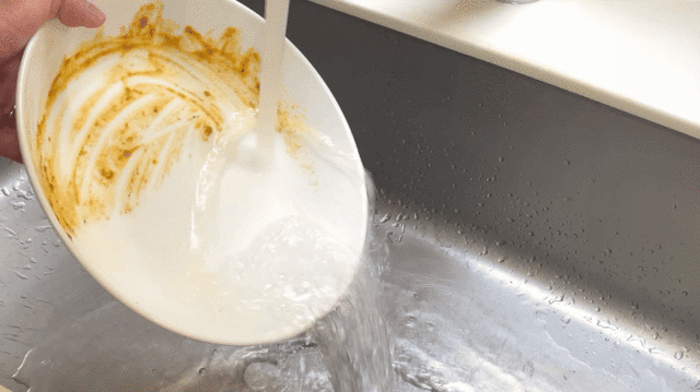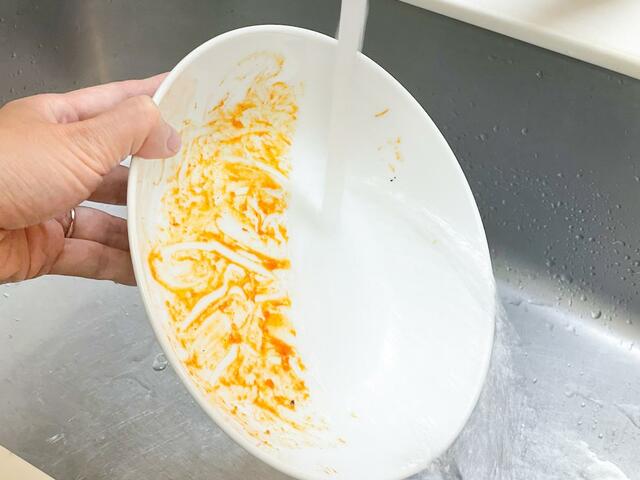 普段はお湯で流して、洗剤をつけた食器で洗うところですが、水でサーッと流すだけで汚れがどんどん流れていきます!