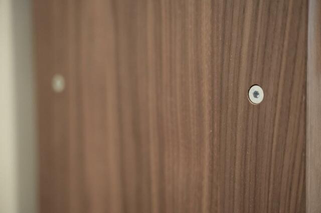 この棚には、壁と本体を固定する、転倒防止補助金具が付いているので、災害対策としてはこの金具を使うとよいかと思います。