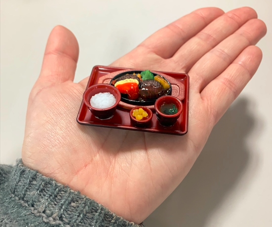 今回ミニチュアになったのは、「ツインハンバーグ和食セット A」や「ジョイフル塩唐揚げ定食」「チョコレートパフェ」などの全6種類のメニュー。サイズは横幅約5cm、高さ約1cm~2.6cm(トレー含む)ほどと手のひらに収まるミニチュアサイズで、トレーから外して並べるとファミレス気分が楽しめます。