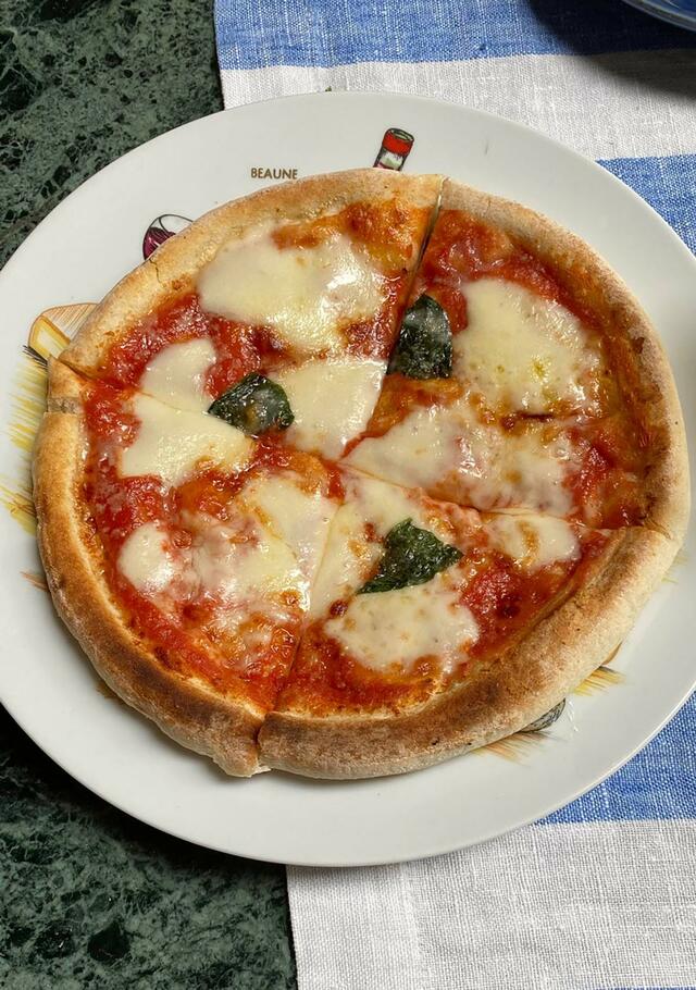 市販の冷凍PIZZA(マルゲリータ)を焼いてみました(リンナイのココットプレートを使用)。う〜む、プロの作っているものもこんな程度の味わいか〜〜、と生意気なことを思った。