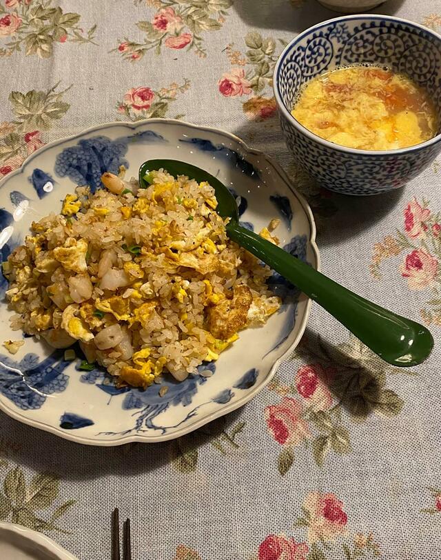 エビチャーハンとトマト&卵のスープ。