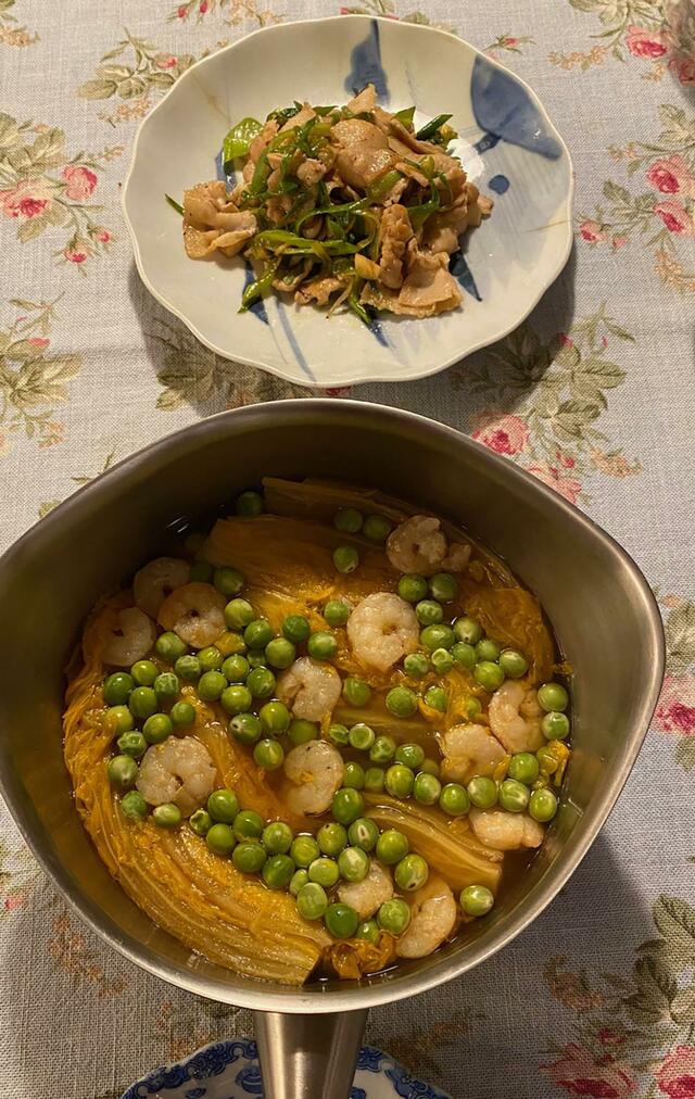 ネギと豚バラ肉のニンニク炒め、オレンジ白菜とエビとうすい豆の煮物。