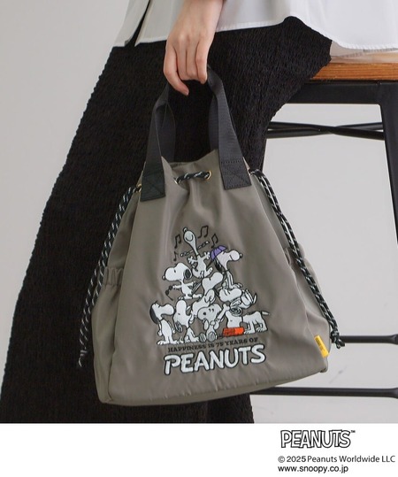 「ナイロン巾着トートバッグ」は、軽くて使い勝手のいいナイロン素材のトートバッグに、さまざまな年代のスヌーピーやウッドストックを刺繍した、75周年ならではの特別デザインです。
