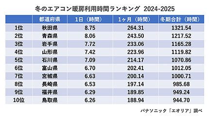 「エオリアアプリ」に接続したエアコン「エオリア」ユーザーの利用データに基づいて、今冬(2024年10月~2025年2月)のエアコン暖房利用時間を算出したところ、秋田県での利用時間がもっとも多く、1日平均8.75時間、1カ月平均では264.31時間となった。利用時間上位7位までの東北・北陸地方では、冬期合計で1000時間以上使用しており、全国平均でも冬期合計は800時間以上の利用時間となっている。