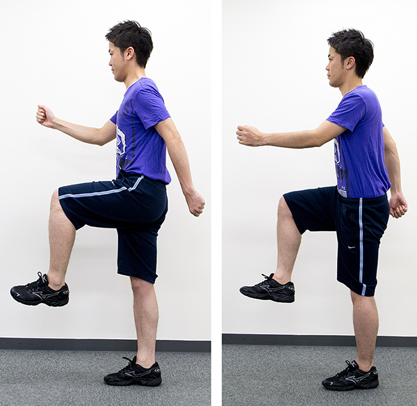 その場で左右の足を上げ下ろし。上げた脚は、太ももが地面と水平になるくらいまでを目標に、支持脚は膝が曲がらないように。左右の脚の入れ替えは、空中で行い、最初はゆっくり、慣れてきたら速さと回数を増やしていきましょう。