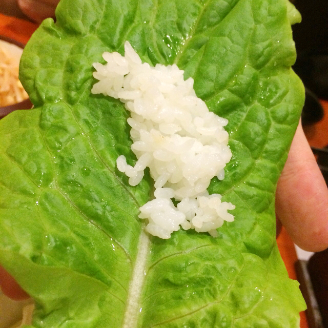 「盛りつけたご飯の上に、肉を乗せる。」これが焼肉サンチュ巻きに於ける基本の型になっております。