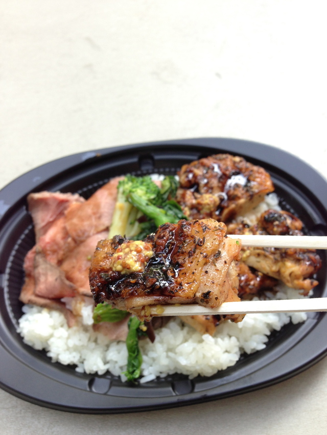 チキンとローストビーフがご飯の上に盛られ、季節の野菜がついています。バルサミコソースがかけられたチキンからは、ハーブのいい香りがします。慌ただしいランチタイムに、少し優雅さを感じられるかもしれません。マスタードを付けて食べれば、味のアクセントになり飽きません。チキンの味つけは日によって変わるので、違う味を楽しみに訪れるのもおすすめです。