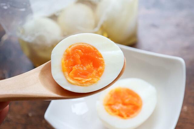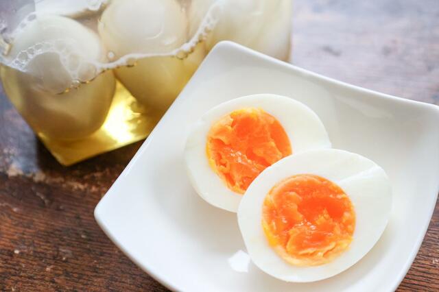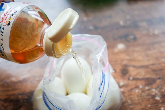 冷蔵庫で2時間漬けると卵の表面に、一晩じっくり漬け込めば中まで味が染み込みます。