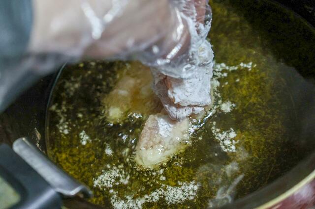 160〜170℃の油で、火が通るまで4〜5分あげます。