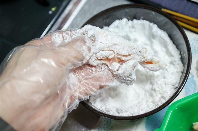 汁気を切ったら片栗粉をまぶして……、