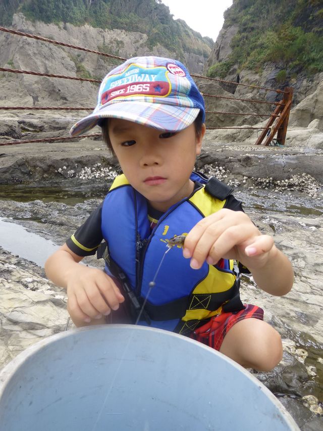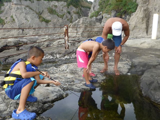 「ヤドカリより、この貝の方がよく釣れる」と発見し、自分で岩に貼り付く貝を採る小1男子 拡大画像表示
