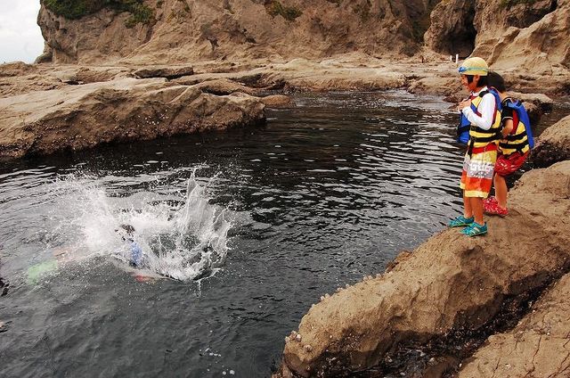 貝が貼りついている岩場を登ってくるのは、子どもたちにとってはなかなか大変だ。「手に力を入れると貝が刺さって痛いから、足に力を入れて!」というアドバイスを受けて、みな上手に登っていく。