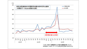 BCNランキングでは、「6か月前」の13年10月に100.5%で前年を上回ったのを起点に、14年3月では159.1%まで上昇したが、翌4月は一気に97.4%に冷え込んだ。内閣府のデータでも、13年10月に106.7%と前年を上回ってから14年3月に191.8%まで急上昇し、翌4月には87.6%まで縮小した。