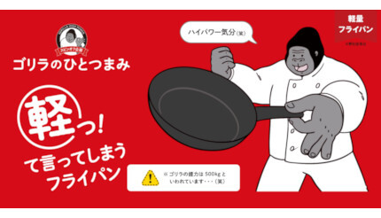 ドウシシャは人気「ゴリラのハイパワー」シリーズのスピンオフ企画として、思わず「軽っ」といってしまうほど軽いフライパン「ゴリラのひとつまみ」を3月22日に発売。ダンベルのような超重量級ジョッキ「ゴリラのひとくち」を3月上旬から発売している。