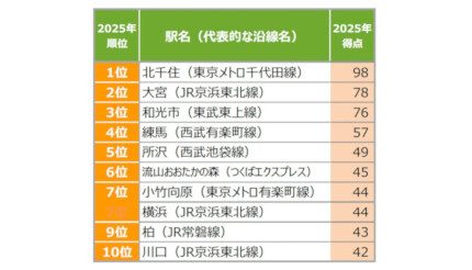 6~10位には「流山おおたかの森」「小竹向原」「横浜」「柏」「川口」が入った。つくばエクスプレス・東武野田線の「流山おおたかの森」は、記憶に残りやすいキャッチコピーでファミリー層の支持を集めている。JR京浜東北線「川口」駅には今年5月、旧そごう川口店の建物をリニューアルした商業施設「三井ショッピングパーク ららテラス川口」がオープン予定。JR・東武野田線の「柏」は前述の通り、千葉県内有数のターミナル駅。「小竹向原」は知名度こそ低いものの、メトロ有楽町線・副都心線(東武東上線と相互直通運転)と西武有楽町線が乗り入れ、高速道路のジャンクション(JCT)に相当する運行上の重要駅となっている。