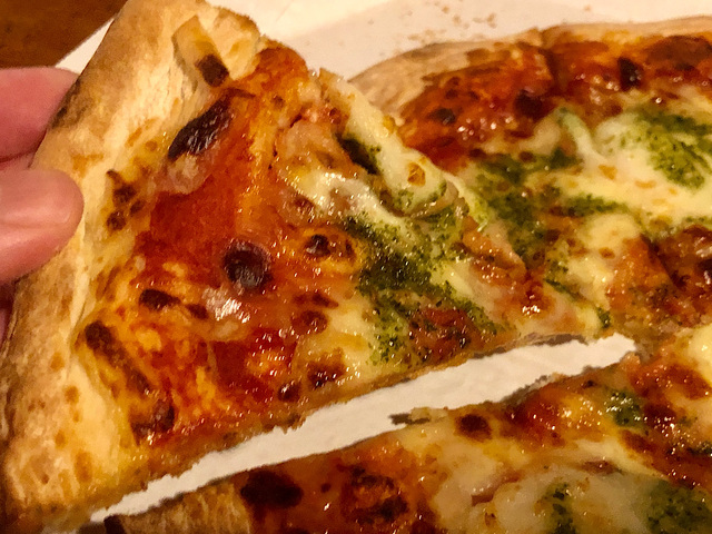 ピザ生地は表面がカリカリ、中はもっちりしており、トマトソースやバジル、チーズの味わいとともに鼻に抜ける香ばしさがたまりません。
