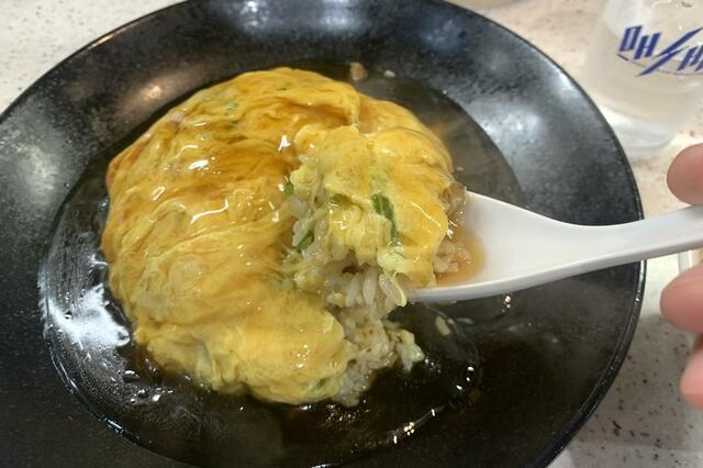 あっつあつの一口目は脳みそに届くほどの美味しさ、だって炒飯の上にふわふわ卵が乗っかって、さらにその上に甘酢の餡がかかってるんだもの。
