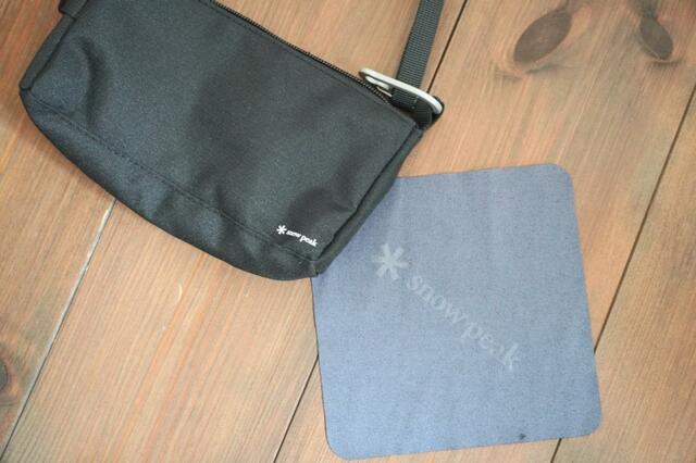 一般的なメガネケースは付属せず、コラボ限定のSnow Peakのロゴ入りのセリートとオリジナルケースが付属してきます。オシャレなんですが、メガネを持ち運びにはやや不安に感じたので、わたしは小さな財布を入れてショルダーバッグとして使用中。身軽でおすすめです。