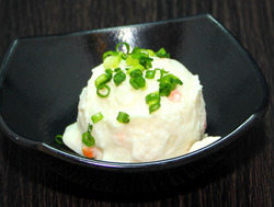 じゃがいもを加熱してマヨネーズと混ぜ、塩、コショウ、砂糖などを加え、少量のたまねぎとにんじんなどを混ぜるポテトサラダ。