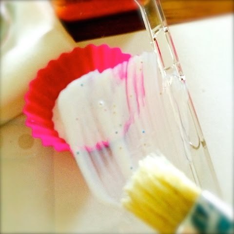 筆にのりを付け、ケース表面に塗ります。