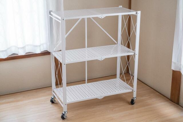 RAKUの「折りたたみラック 3段」は、Amazonで見つけた折りたたみできる棚。