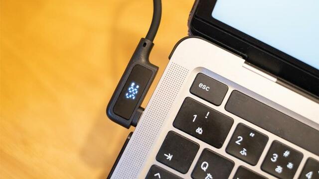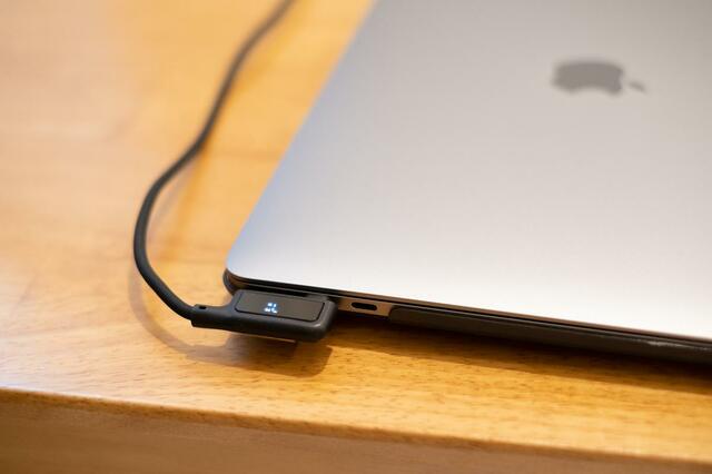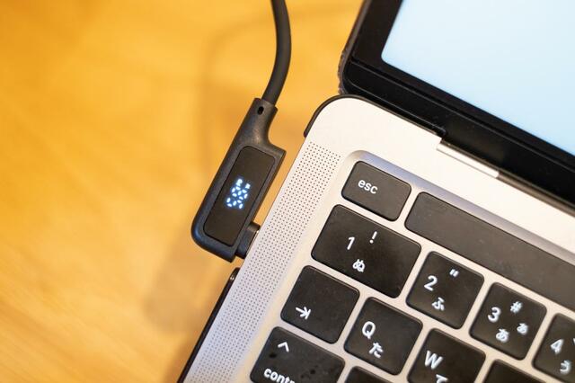 「ケーブルをMacBookに挿したのに、充電器側が抜けていて充電されてなかった……」なんてミスを時々していたんですが、これを使えば通電中は画面が光るので、ひと目で給電されているかどうか分かります。