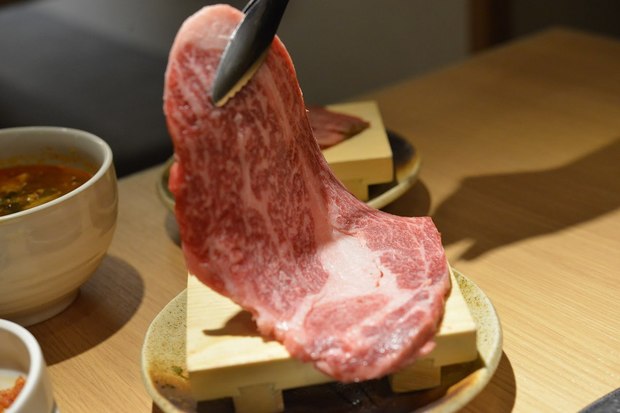 続いて、焼肉先生が誇る特別なお肉、「熟成肉」をいただきます! 熟成肉とは、塊状の肉をゆっくり1ヶ月ほどかけて熟成させることで、濃厚な味わいへと変化した肉のこと。沼津さんによると、熟成方式にはドライエージングとウェットエージングの2種類があるとのことですが、焼肉先生では国産牛の旨さを追求した結果、ウェットエイジングを用いているそうです。