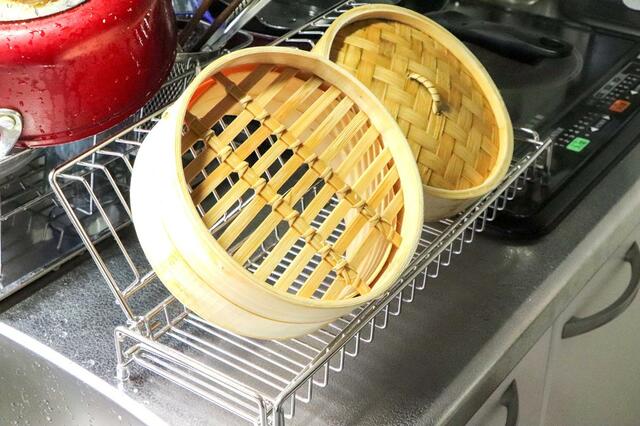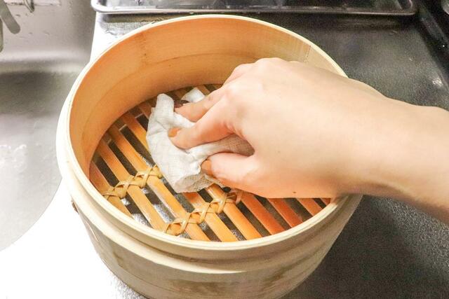 蒸し料理をするときは、蒸篭全体をさっと水で濡らします。これによって、せいろが焦げるのを防いでくれるのだそう。