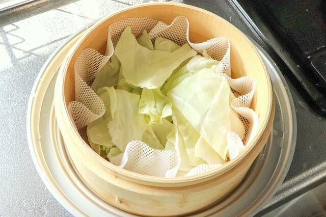方法はたっぷりのお湯を沸かした鍋の上に受け台をのせ、その上に蒸篭と蓋をセット。15分ほど中火で蒸すだけとシンプル。
