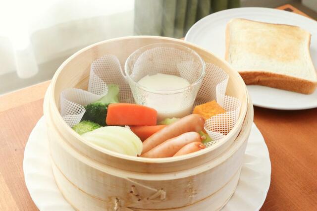 蒸篭の中に野菜やウインナー、卵を落とした耐熱容器などをぎゅっと詰めて蒸すだけで、あっという間に朝ごはんが完成しました。